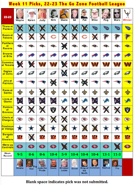 The missed game between the Falcons and the Bears messed me up quite a bit this week. Also, keep in mind that the games start at 12:30, and as I am going to Punta Gorda for Thanksgiving I'll need your picks by 11 at the latest. Thanks